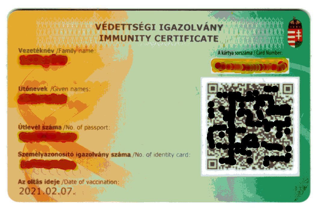 egy olvasójuk kártyáját. Csúf kis lapocska az is, nyivászna íráskarakterekkel (gyengébb fényben bizonyára olvashatatlan), a látványát egy erőteljes QR-kód uralja. Viszont adatsora eltérő az enyémtől. Azon valóban szerepel érvényességi határidő, ám nincs rajta az oltás dátuma. Az enyémen fordítva, ez utóbbi olvasható, a másik nem. Az enyémen a kezdet, az övén a vég.