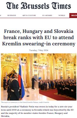 Magyar-, Franciaország és Szlovákia – egy-egy személlyel képviseltetvén magát – ünnepelte Vlagyimir Putyin újbóli beiktatását Moszkvában. Hogyan eshetett ez meg? Ennek járt utána a Brüsszeli Idők, The Brussels Times.