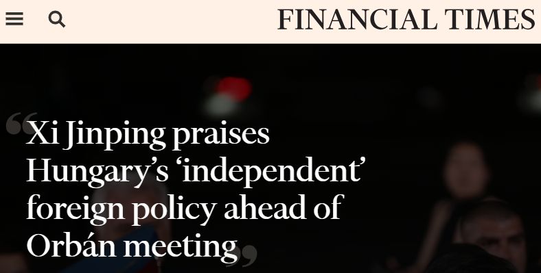 A kínai elnök megdicsérte a „független” magyar külpolitikát – írja a Financial Times, s a független szót időzőjelbe téve. Az írás egyébként ismerteti a Magyar Nemzet című nyomtatványban közölt Hszi csin-ping-üdvözletet is, akinek szerdai, szerbiai útja kapcsán is – nem mellékesen – megjegyzi, hogy Kína azokkal a szuverén államokkal való kapcsolat kiépítésére törekszik, amelyek szembeszállnak az „amerikai hegemóniával” – miként fogalmazott. Két nappal ezelőtt az 1. számú kínai ezt mondta a francia elnöknek: útjának célja, hogy rávegye az európai országokat: határolódjanak el az amerikai külpolitikától. Egyébként visszatérő kommunikációs fordulata „a közös jövő globális közösségének” emlegetése, amiről – a szerb elnökkel – nagyon egyszerűen kimondva, tulajdonképpen meg is állapodott.