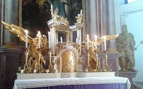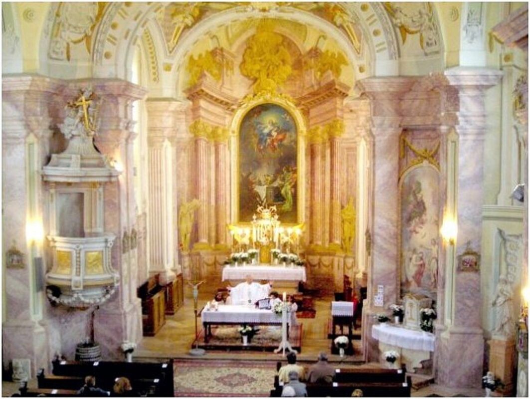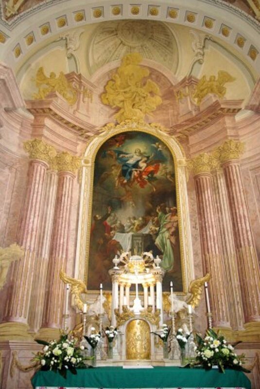 A főoltár rendkívüli megoldása, a félköríves oszlopcsarnok modellje a háttérben lévő falfestmény  építészeti elemeinek térhatását erősíti.