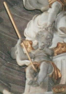 A szószék hangvetőjére helyezett puttó. Roszt Simon műve