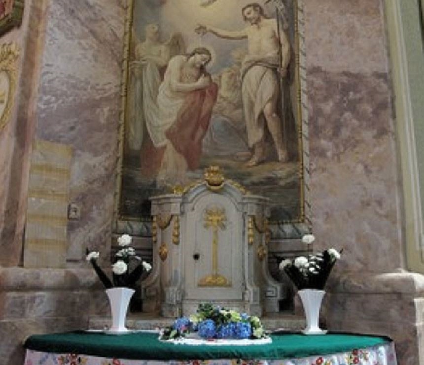 Nova község 1778-ban épült templomának szentélye. Balra a szószék, vele szemben a másik oldalon a Keresztelő Szent János oltár.