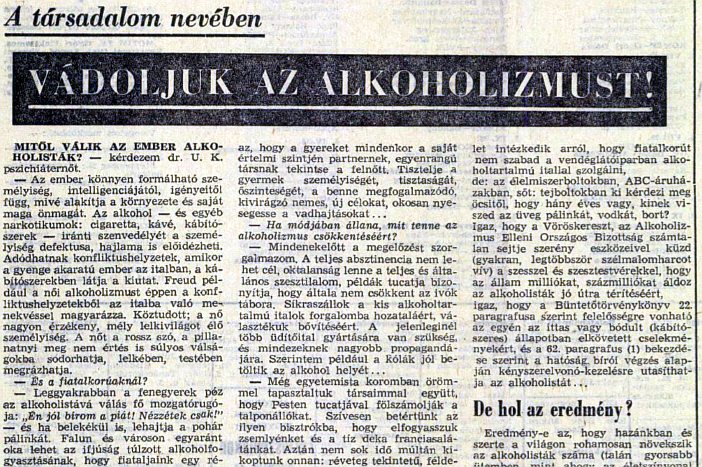 Ki kell mondanom, különben megfojt a vélemény: társadalmi méretekben szükség lenne erkölcsi normarendezésre, őszinte önkritikára. Mert: igaz, hogy az egyik oldalon következetes harcot hirdetünk és folytatunk az alkoholizmus ellen, sok jogszabály, rendelet intézkedik arról, hogy fiatalkorút nem szabad a vendéglátó-iparban alkoholtartalmú itallal kiszolgálni, de: az élelmiszerboltokban, ABC-áruházakban, sőt: tejboltokban ki kérdezi meg öcsitől, hogy hány éves vagy, kinek viszed az üveg pálinkát, vodkát, bort?