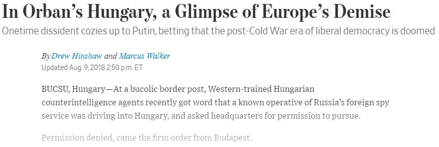 Orbán számára jelenleg még fontos a brüsszeli pénz és katonai védelem, de hosszú távon tönkreteszi az uniót – írja a konzervatív The Wall Street Journal. Magyarország futó pillantást kínál arra, miként végzi Európa, miután Orbán Viktor, az egykori ellenzéki Putyinhoz törleszkedik, és azt gondolja, hogy vége a liberalizmus korának.