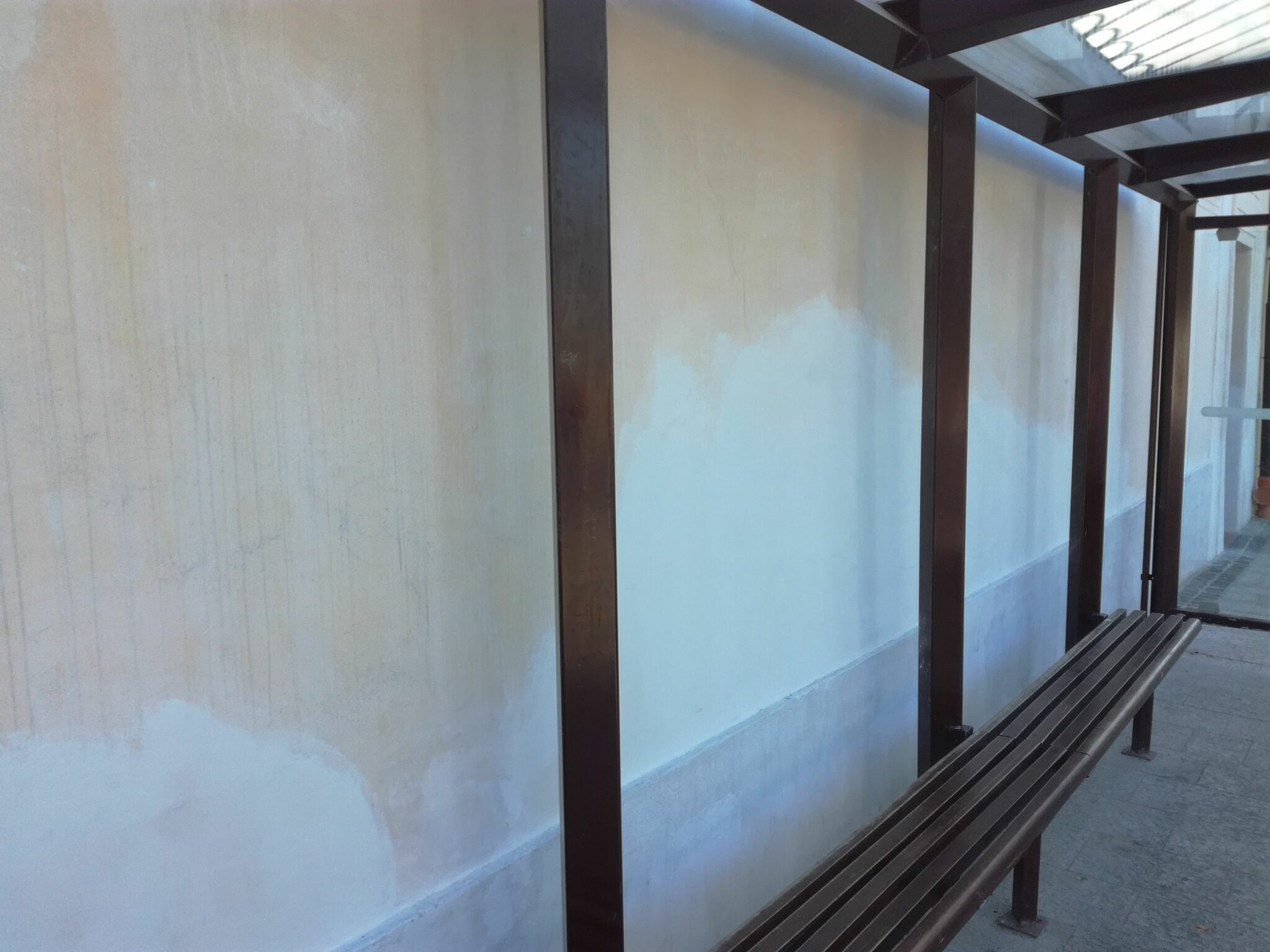 Most viszont örömmel konstatáltuk, hogy mégis csak lefestik a buszmegállót elcsúfító falfelületet. Természetesen kivártak csaknem háromnegyed évet, hogy még a látszatát is elkerüljék: azért intézkedtek, mert az Infovilág kifogásolta a felújítás közben tapasztalt múlt év végi „feledékenységet”.