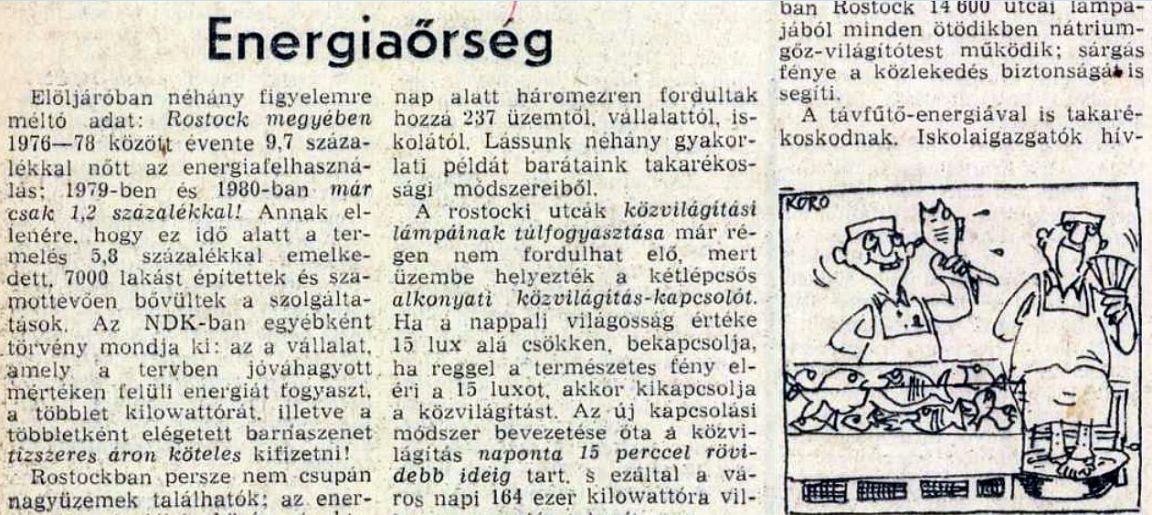 Elöljáróban néhány figyelemre méltó adat: Rostock megyében 1976–78 közölt évente 9,7 százalékkal nőtt az energia-felhasználás; 1979-ben és 1980-ban már csak 1,2 százalékkal! Annak ellenére, hogy ez idő alatt a termelés 5,8 százalékkal emelkedett. 7000 lakást építettek és számottevően bővültek a szolgáltatások. Az NDK-ban egyébként törvény mondja ki: az a vállalat, amely a tervben jóváhagyott mértéken felüli energiát fogyaszt, a többlet-kilowattórát, illetve a többletként elégetett barnaszenet tízszeres áron köteles kifizetni!