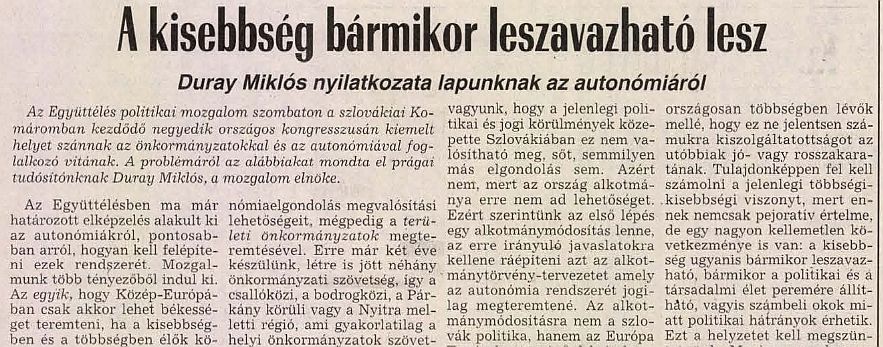 A magyar–csehszlovák viszonyban állandó problémaforrás volt a nemzetiségi kérdés (a bősi vízlépcső ügye mellett). Cikkünk szerzője még prágai tudósítóként is gyakran volt a szlovák főváros vendége, az ország szétválásával az addiginál is egyértelműbbé vált, hogy a probléma Szlovákiában tapasztalható inkább, így a megoldást is északi szomszédunknál kell keresni. Az új ország legnépesebb kisebbsége a lakosság tíz százalékát alkotó felvidéki magyarság lett, az ő politikai köreikben fogalmazódott meg a legmarkánsabban az autonómia gondolata. A ma is több szomszédunknál napirenden lévő témáról legismertebb képviselőjük, Duray Miklós nyilatkozott akkor a Népszabadságnak; a legnagyobb példányszámú napilap 1993. február 26-án közölte Duray véleményét. (A nyitó képen: Duray Miklós; foto: flickr.)