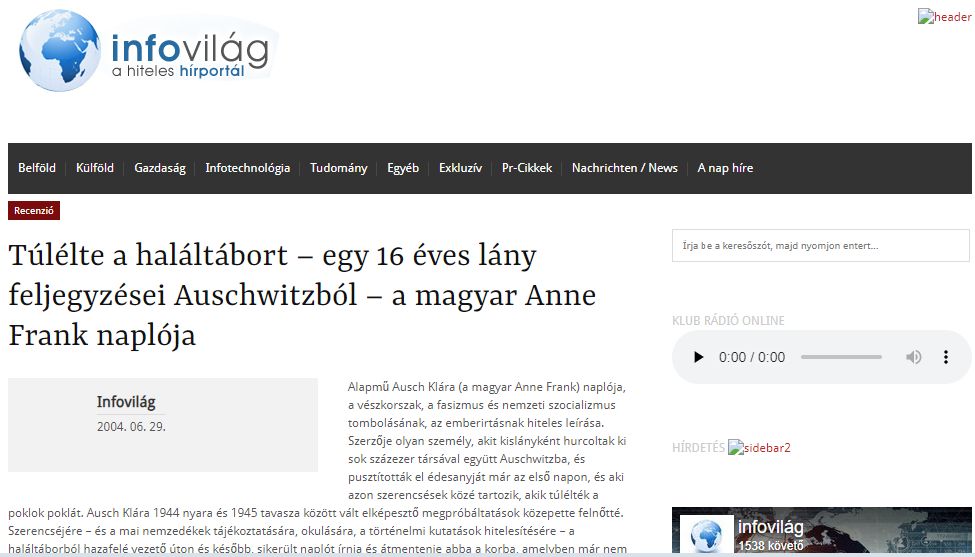 „Túlélte a haláltábort – egy 16 éves lány feljegyzései Auschwitzból – a magyar Anne Frank naplója” – ezzel a címmel jelent meg Ausch Klára önéletrajzi kötetének bemutatója a 2000-ben alapított Infovilág (www.infovilag.hu) hírportál húsz évvel ezelőtti (2004. június 29., 20:29) tudósításaként. Lapunk cikke ma már nem olvasható az eredeti helyén, tekintettel arra, hogy lapunkat tavaly nyár végén értelmetlen és különösen durva, pusztító DDoS-(szolgáltatásmegtagadásos) támadás érte, amikor válogatás nélkül, sok száz cikkünk semmisült meg. Az alábbi írásra a világ-internet archívumában bukkantunk rá, és most közzé tesszük mindenekelőtt fiatal olvasóink számára: