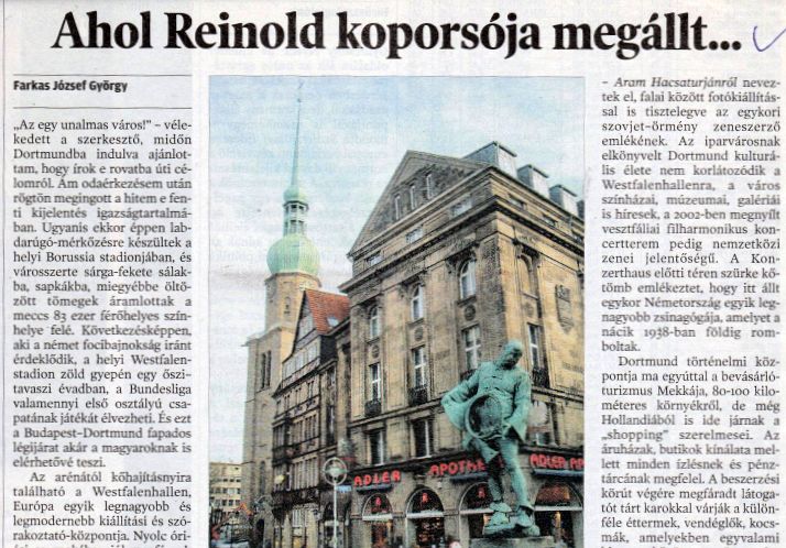 Ezek után térjünk be a 600 ezres város zöldövezetéből magába a központba, annál is inkább, mert még adósok vagyunk a cikk címében szereplő talányos esemény leírásával. A szóban forgó Reinold, egy 11. században élt lovag részt vett a kölni dóm építésében, ám ott – vezeklés címén – csak a munkájáért járó bér töredékét fogadta el, amit társai nem néztek jó szemmel, és ezt a jámbor férfiú agyonverésével juttatták kifejezésre. A Reinold koporsóját szállító targonca azonban magátói elindult, és Dortmundig gurult. Ahol megállt, ott építették fel – a lovagot szentként tisztelők – a nevét viselő templomot, amely ma is a városmag meghatározó eleme. A második világháborúban a Ruhr-vidéket ért angolszász bombatámadásokban a Reinoldkirche is súlyosan megsérült, de 1954-re helyreállították. Az ily módon megmentett műemlékek sorába tartozik a vele szomszédos zeneiskola is, amit – ezen a tájon eléggé rendhagyó módon – Aram Hacsaturjánról neveztek el, falai között fotókiállítással is tisztelegve az egykori szovjet-örmény zeneszerző emlékének. Az iparvárosnak elkönyvelt Dortmund kulturális élete persze nem korlátozódik a Westfalenhallenra, a város színházai, múzeumai, galériái is híresek, a 2002-ben megnyílt vesztfáliai filharmonikus koncertterem pedig nemzetközi zenei jelentőségű. A Konzerthaus előtti téren szürke kőtömb emlékeztet arra, hogy itt állt egykor Németország egyik legnagyobb zsinagógája, amit a nácik 1938-ban földig romboltak.