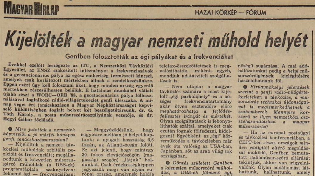 – Nem utópia: a magyar távközlés számára a most kijelölt „égi parkolóhely” és a bőséges frekvenciatartomány akár ötven esztendőre előre meghatározhatja a fejlődés, fejlesztés irányát és mértékét. Olyan szolgáltatások is lebonyolíthatók ezáltal, amelyeket csak ezután fognak fölfedezni, kidolgozni! Egyébként az „égi” közreműködés a távközlésben már évek óta valóság az USA-ban, Japánban, sőt az arab világ sok országában.