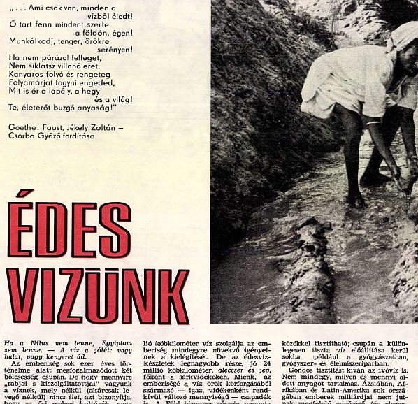 Pár nappal ezelőtt, március 22-én volt a víz világnapja. A víz legalább annyira nélkülözhetetlen eleme élővilágunknak, az emberi életnek, mint a levegő. Amikor az újságíró, a szerző archívumából elővett alábbi írás készült, még nem volt világnapja a víznek, mert az emberiség igen nagy többsége azt hitte-vélte: ez az elem kifogyhatatlan, elhasználhatatlan, hiszen a Föld népességének igen nagy része nem szomjazik, akárhányszor mosakodhat, fürödhet, locsolhat és öntözhet (pazarolhatja akár!): víz van bőséggel. Csak nagyon kevesen hívták föl akkor a figyelmet bolygónk száraz, aszályos területeire, azokra az embertársainkra, akik ritka kincsként vigyázzák kevéske vizüket, mert nélküle meghalnának, véglegesen elpusztulna az a kevéske emberi, állati, növényi élet is, ami még létezik körülöttük. A szeszélyes időjárás manapság talán a legnagyobb vízfogyasztó: a hőség elszippantja, az árvizek elszennyezik…Akkor, amikor a nagy példányszámú és országosan olvasott Magyar Hírlap képes mellékletében megjelent az Édes vizünkről szóló összeállítás, idestova 38 évvel ezelőtt (1984. szeptember 15.), legföljebb csak sejtettük, előbb-utóbb megszűnhet a vízbőség, legalább is a jó minőségű édesvíz-bőség. Sajnos, e sejtés az utóbbi években valósággá vált. Kevés a jó minőségű ivóvíz a Földön. Oka: a lakossággyarapodás, a mezőgazdasági és ipari termelés irdatlan növekedése, és mindenekelőtt a felelőtlen, pazarló bánásmód az életet fenntartó édesvízzel. Bár ma már milliárdok tudják, hogy takarékosan kell bánnunk a vízzel, sajnos, még mindig nem elegen. Ráadásul bolygónk vízkészletének 97,5 százaléka eleve alkalmatlan emberi fogyasztásra. Nézzük, miként tekintettünk a vízre csaknem négy évtizeddel ezelőtt! (A nyitó kép forrása: jenawasser.de)