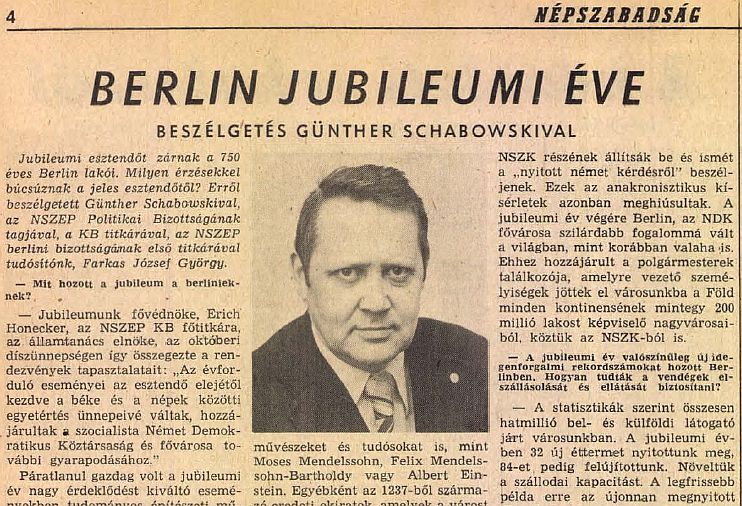 Kiemelkedő esztendő volt az 1987. a német főváros háromnegyed évezredes történetében, akkor még Kelet- és Nyugat-Berlinében egyaránt. A Népszabadságnak adott interjút az NDK ‘fővárosa’ pártszervezetének első embere, összefoglalva a jubileumi év eseményeit és tanulságait. (Ő volt az, akinek két év múlva egy véletlen – vagy szándékos? – elszólása nyomán felemelkedtek a két városrészt egymástól elválasztó Fal sorompói…) A cikk a legnagyobb példányszámú hazai napilapban 1987. december 22-én jelent meg.