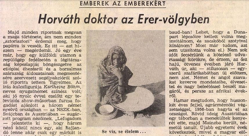 Karlheinz Böhm (1928-2014, a színész, aki az 1950-es években a „Sissi” című filmtrilógiában Ferenc József császár szerepével vált híressé, olyan neves rendezők filmjeiben, mint Rainer Werner Fassbinder, és a nagy német nyelvű színpadok színészeként tündökölt – a szerk. megj.) neves nyugatnémet színész volt, aki jó nyolc évvel ezelőtt egy televíziós show-műsorban furcsa fogadást ajánlott a három németnyelvű országban – az NSZK-ban, Svájcban és Ausztriában – sugárzott program nézőinek. „Fogadok – jelentette ki –, hogy három néző közül nincs egy, aki hajlandó lenne akár csak egy márkát is áldozni az afrikai Szahel-övezet éhezőinek megsegítésére. Ha tévednék – tette hozá –, veszem a kalapom, és magam megyek Afrikába, hogy – megkerülve a hivatalos segélyszervezeteket – a leginkább rászorulóknak juttassam el a befolyt pénzeket.”
