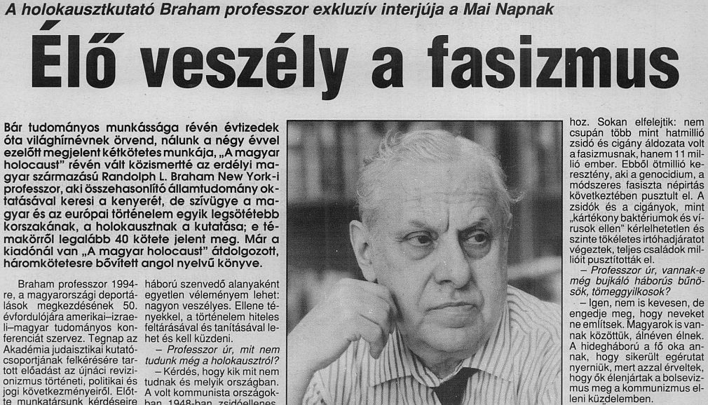 Bár tudományos munkássága révén évtizedek óta világhírnévnek örvend, nálunk a négy évvel ezelőtt (1988-ban – a szerk. megj.) megjelent kétkötetes munkája, „A magyar holocaust” révén vált közismertté az erdélyi magyar származású Randolph L. Braham New York-i professzor, aki összehasonlító államtudomány oktatásával keresi a kenyerét, de szívügye a magyar és az európai történelem egyik legsötétebb korszakának, a holokausztnak a kutatása; e témakörről legalább 40 kötete jelent meg. Már a kiadónál van „A magyar holocaust” átdolgozott, háromkötetesre bővített angol nyelvű könyve.