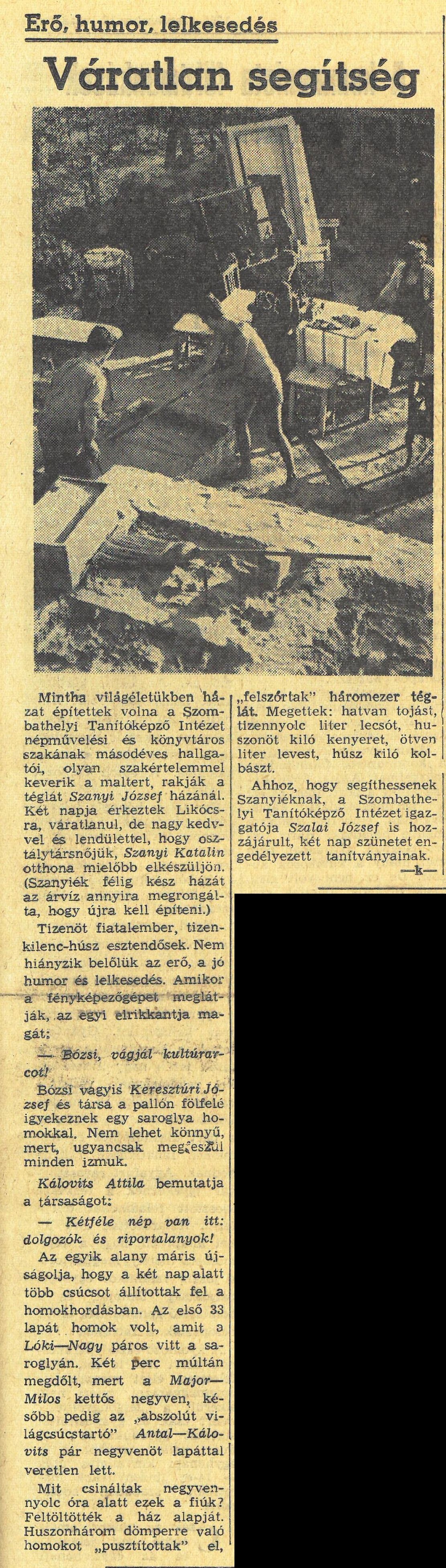 Mintha világéletükben házat építettek volna a Szombathelyi Tanítóképző Intézet népművelési és könyvtáros szakának másodéves hallgatói, olyan szakértelemmel keverik a maltert, rakják a téglát Szanyi József házánál. Két napja érkeztek Likócsra, váratlanul, de nagy kedvvel és lendülettel, hogy osztálytársnőjük, Szanyi Katalin otthona mielőbb elkészüljön. (Szanyiék félig kész házát az árvíz annyira megrongálta, hogy újra kell építeni.)