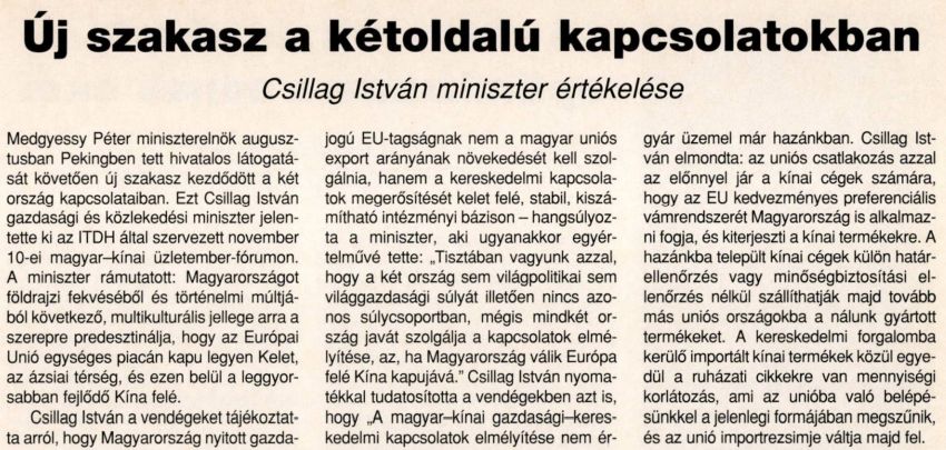 Medgyessy Péter miniszterelnök 2003 augusztusában Pekingben tett hivatalos látogatását követően új szakasz kezdődött a két ország kapcsolataiban. Ezt Csillag István gazdasági és közlekedési miniszter jelentette ki a Magyar Befektetési és Kereskedelemfejlesztési Zrt. (ITDH) által szervezett november 10-i magyar–kínai üzletember-fórumon. A miniszter rámutatott: Magyarországot földrajzi fekvéséből és történelmi múltjából következő multikulturális jellege arra a szerepre predesztinálja, hogy az Európai Unió egységes piacán kapu legyen a Kelet, az ázsiai térség, és ezen belül a leggyorsabban fejlődő Kína felé. Csillag István az üzletember-fórum vendégeit tájékoztatta arról, hogy Magyarország nyitott gazdaságú ország, amelyre a világgazdaság bármilyen fordulata erősen hat. Ezt támasztotta alá azzal az adattal, hogy az export és az import együttvéve az éves nemzeti termék 120 százalékát adja. Az EU-ba irányuló export pedig a teljes magyar kivitel több mint 75 százalékát teszi ki.