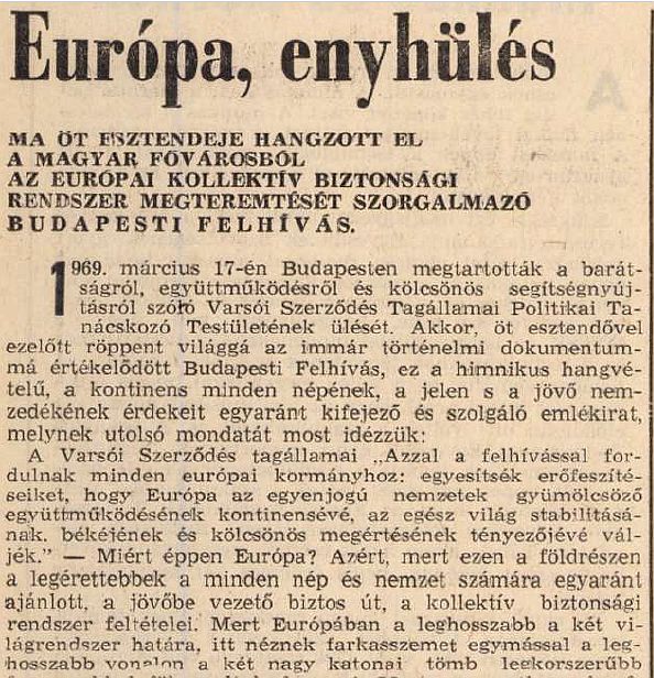 1969. március 17-én Budapesten megtartották a barátságról, együttműködésről és kölcsönös segítségnyújtásról szóló Varsói Szerződés Tagállamai Politikai Tanácskozó Testületének ülését. Akkor, öt esztendővel ezelőtt röppent világgá az immár történelmi dokumentummá értékelődött Budapesti Felhívás, ez a himnikus hangvételű, a kontinens minden népének, a jelen s a jövő nemzedékének érdekeit egyaránt kifejező és szolgáló emlékirat, melynek utolsó mondatát most idézzük: