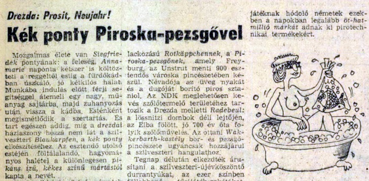 Amikor az alábbi helyszíni beszámoló készült (az 1980-as évek elején, pontosan: 1983. december 31-én jelent meg a Magyar Hírlapban) Németország keleti felében, a valamikori NDK-ban, bizony, nem volt egyszerű a helybélieknek beszerezniük az évvégi ünnepek valamennyi tartozékát. Gyakran kellett sorba állni, mert nem kevés fogyasztási (és tartós) cikkből csak egy bizonyos mennyiség állt rendelkezésre, és persze ennek megfelelően a választék is meglehetően gyatra volt. Akárcsak nálunk, otthon, a keletnémeteknek is ügyeskedniük kellett a vásárláskor. Emlékszem, a hozzánk érkező „endékások” korántsem halasi csipkére költötték szerény forintellátmányukat, és a hozzájuk kijutott hazánkfiai sem Bach-hangversenylemezeket vásároltak elsősorban… Az évvégi ünnepkör némi kivételezéssel járt: olyankor mintha lazult volna a tervgazdálkodás időnként még bennünket, „táborbelieket” is megdöbbentő szigorúsága, és viszonylag gyorsan s könnyen lehetett hozzájutni kiváló minőségű és meghökkentően olcsó termékekhez. Bizony: a minőséget és a mesterségesen alacsonyan tartott fogyasztói árakat, valamint fizetéseket még a leleményes németek sem tudták összeegyeztetni… És a „hagyományos” sorban állás (Schlange stehen) akkor sem volt ritkaság. Az év utolsó napjaiban a fegyelmezett németek kötelességszerűen félre tették a köznapi bosszúságaikat, és szórakoztak a maguk módján. Íme:
