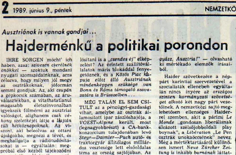 Meg talán el sem csitult az a pénzügyi-gazdasági vihar, amelybe az osztrák államosított ipar zászlóshajója, a VOEST-Alpine került, most (legnagyobbrészt) a CA-bankkonzorcium tulajdonában levő Steyr–Daimler–Puch autó- és traktorgyár állítólagos milliárdos vesztesége lett elsőoldalas téma az ország sajtójában. Az ügyet egy szabadságpárti képviselő kezdte el szellőztetni. Annak a pártnak a politikusa, amely a már említett márciusi választásokon négy évtizedes történelme legnagyobb diadalát aratta.