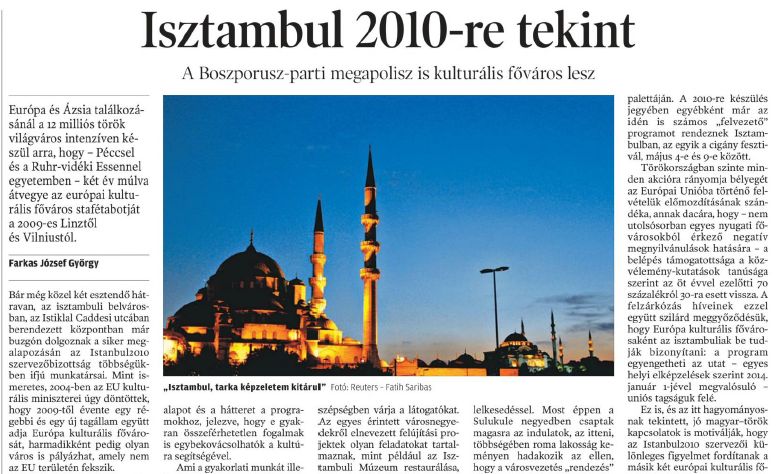 Szerzőnk a Boszporusz partján nézett utána, hogyan készül a nem-EU-tag Törökország megapolisza az Európa kulturális fővárosának címével járó kihívásokra. Cikke 2008. február 13-án jelent meg a legnagyobb példányszámú hazai napilapban, a Népszabadságban. (A nyitó képen: Hagia Szophia, a bizánci építésű hajdani ortodox bazilika Isztambulban.)