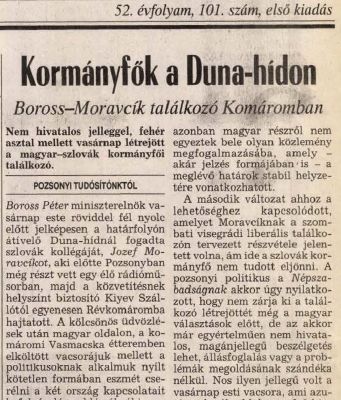 «Boross Péter miniszterelnök vasárnap este röviddel fél nyolc előtt jelképesen a határfolyón átívelő Duna-hídnál fogadta szlovák kollégáját, Jozef Moravčíkot, aki előtte Pozsonyban még részt vett egy élő rádióműsorban, majd a közvetítésnek helyszínt biztosító Kiyev Szállótól egyenesen Révkomáromba hajtatott. A kölcsönös üdvözlések után magyar oldalon, a komáromi Vasmacska étteremben elköltött vacsorájuk mellett a politikusoknak alkalmuk nyílt kötetlen formában eszmét cserélni a két ország kapcsolatait befolyásoló problémákról is.