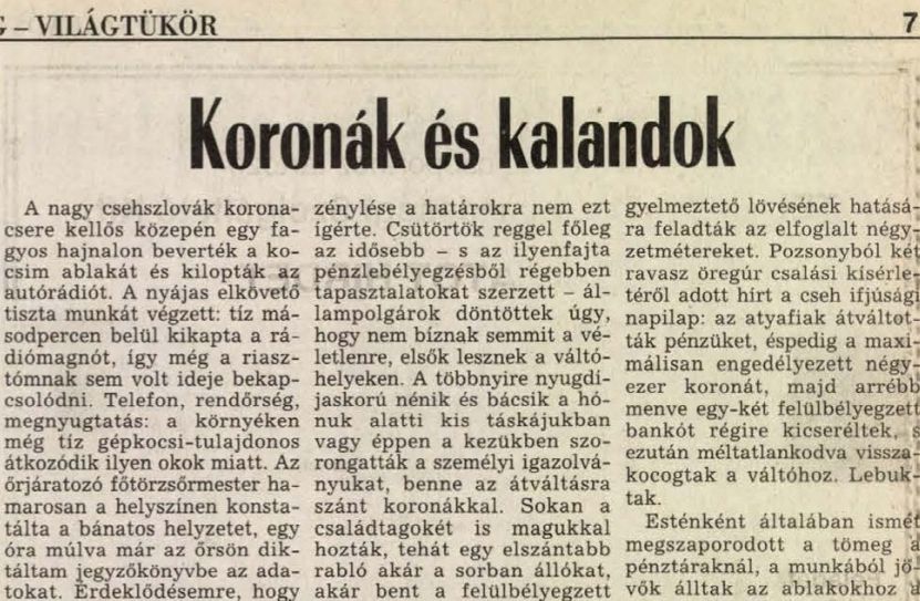 Esténként általában ismét megszaporodott a tömeg a pénztáraknál, a munkából jövők álltak az ablakokhoz a cserét lebonyolítani. Fültanúk szerint sem reggel, sem este; de napközben sem lehetett lelkesedést tapasztalni az emberek között, annál gyakrabban hangzott el mind Csehországban, mind Szlovákiában, hogy a fenének kellett ez az egész. Mert igaz, hogy a két fél hétfőtől gyakorlatilag korlátlanul válthatja át egymás új valutáját, (egyszerre 7500 koronát és akármennyi csekket át lehet vinni hivatalos igazolással a szlovák-cseh határon), és ennek fedezetéül a két nemzeti bank máris átküldött egymásnak 200-200 milliót saját bélyegzésű pénzéből. Ám a határellenőrzés, a vámolás, az elmúlt hétvége felzaklatott kedélyei („elég lesz-e a pénz, amit nem váltottunk be, viszont nem marad-e a nyakunkon?”), de a vállalatok közötti átutalások átmeneti leállítása, az államközi fizetési megállapodás megkötésével kapcsolatos éjfélbe nyúló tárgyalások is mind-mind azt a nem is régi, annak idején a szocializmusra kitalált viccet aktualizálják, hogy ez a helyzet nem más, mint harc azok ellen a problémák ellen, amelyek egyébként nem lennének…