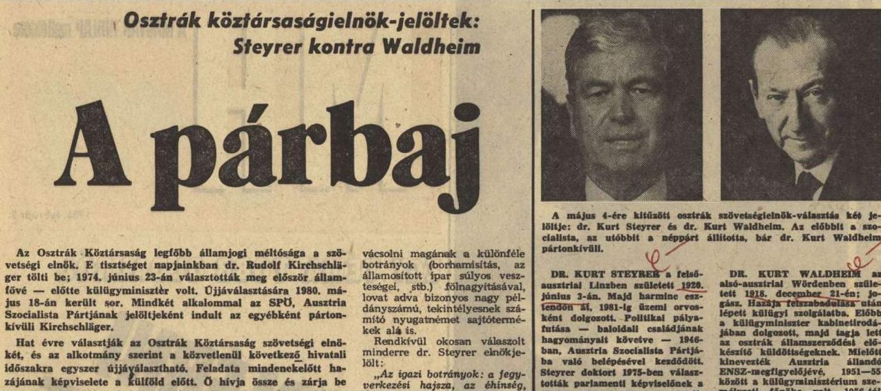 A pártonkívüli, de az Osztrák Néppárt, az ÖVP színeiben másodszor is induló (másfél évtizeddel ezelőtt dr. Kirchschlägerrel mérkőzvén, maradt alul) dr. Kurt Waldheim jelölése dr. Steyrernél jóval előbb megtörtént. A Waldheimet indító és fölkészítő ÖVP nem sajnál apait-anyait, csakhogy minél előnyösebb színben tüntesse föl jelöltjét.