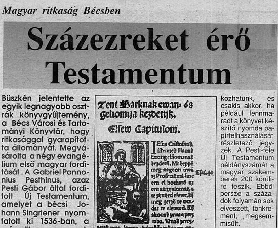 «Büszkén jelentette az egyik legnagyobb osztrák könyvgyűjtemény, a Bécs Városi és Tartományi Könyvtár, hogy ritkasággal gyarapította állományát. Megvásárolta a négy evangélium első magyar fordítását. A Gábriel Pannonius Pesthinus, azaz Pesti Gábor által fordított Új Testamentum, amelyet a bécsi Johann Singriener nyomtatott ki 1536-ban, a második magyar nyelvű, nyomtatott könyv. A bécsi városháza sajtótájékoztatóján közölt hír olvastán érdeklődtünk az Országos Széchényi Könyvtárban: