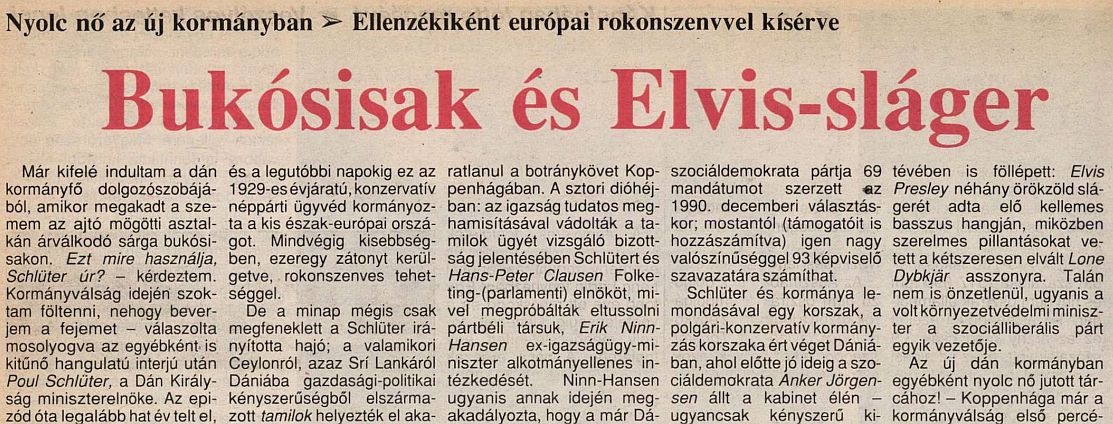 «Már kifelé indultam a dán kormányfő dolgozószobájából, amikor megakadt a szemem az ajtó mögötti asztalkán árválkodó sárga bukósisakon. Ezt mire használja, Schlüter úr? – kérdeztem. Kormányválság idején szoktam föltenni, nehogy beverjem a fejemet – válaszolta mosolyogva az egyébként – is kitűnő hangulatú interjú után Poul Schlüter, a Dán Királyság miniszterelnöke.
