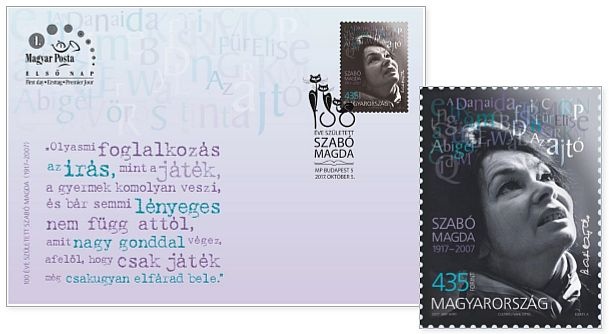 Alkalmi bélyeg kibocsátásával emlékezett meg a Magyar Posta a Szabó Magda írónő (1917-2007) születésének 100. évfordulójáról. A bélyeg Elekes Attila grafikusművész tervei szerint 200 000 példányban készült az ANY Biztonsági Nyomda Nyrt.-ben.