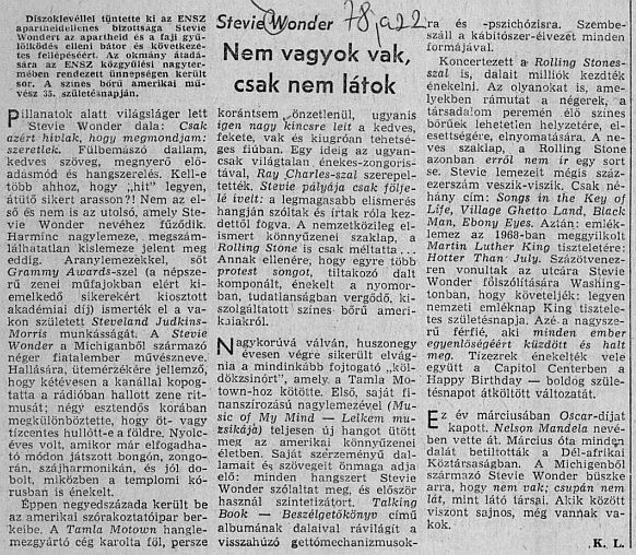 Ez év márciusában Oscar-díjat kapott. Nelson Mandela (az akkoriban harmadik évtizede börtönben sinylődő dél-afrikai, apartheidellenes aktivista – a szerk.) nevében vette át. Március óta (Stevie Wonder) minden dalát betiltották a Dél-afrikai Köztársaságban. A Michigenből származó Stevie Wonder büszke arra, hogy nem vak, csupán nem lát, mint látó társai. Akik között viszont sajnos, még vannak vakok.