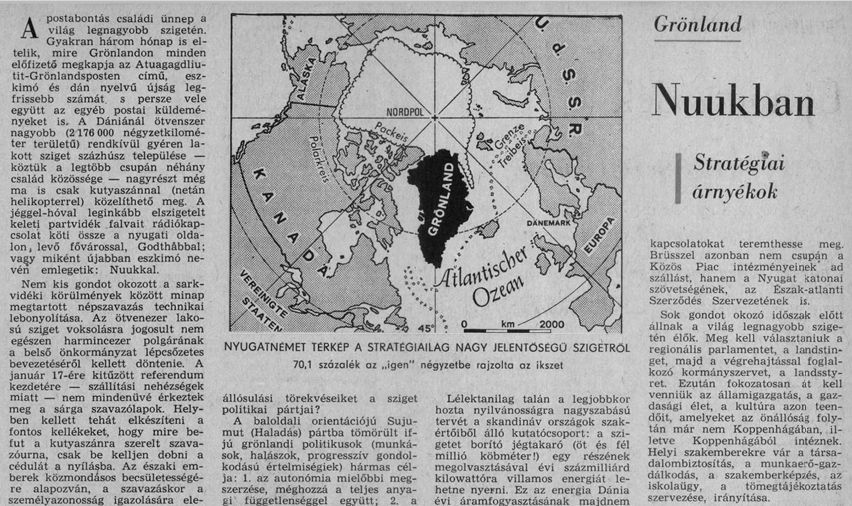 Nem valószínű, hogy mostanság magyar újságíró elemző írásban foglalkozott volna Kalaallit Nunaattal (Emberek országával), a világ legnagyobb szigetével, azaz Grönlanddal… Legföljebb turisztikai-idegenforgalmi vonatkozásban említtetett a viking Vörös Erik által fölfedezett „Zöld sziget” nagyjából abban az időben, amikor a magyarok elözönlötték a Kárpát-medencét. Korántsem számított azonban ritkaságnak, ha egy magyar politikai hetilap, a dr. Pálfy József által alapított, a maga idejében kiemelkedően újszerűnek, példásan igényesnek számító „Magyarország” igyekezett beszámolni a világ valamennyi részén történtekről. Ekként ért a (többi között) a megtiszteltetés, hogy publikáljak a Grönlandon a most éppen 45 esztendővel ezelőtt tartott referendumról. Archívumomból a „Magyarország” 1979. 2. heti számát vettem elő, hátha hasznára válik annak, aki földrészünk (és a világ) legkülönlegesebb térségével foglalkozik manapság. Az ám, egy megjegyzés: ma már, tekintettel a világ hatalmas változásaira és olyan információk nyilvánosságra kerülésére, amelyek 45 évvel ezelőtt még titoknak számítottak, bizony, másképp írtam volna meg ezt a cikket… (A nyitó képen: a kelet-grönlandi Tasiilaq látképe.)