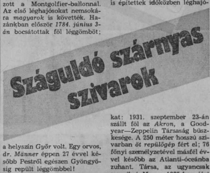 Máig nem adta föl az emberiség (no, jó, a mérnökök és üzletemberek egy része) a sok száz esztendős álmot, hogy léghajókkal, óriási, hangtalanul haladó – sőt, száguldó – szárnyas szivarokkal, léghajókkal oldja meg a légi közlekedés egy részét. Léghajóval ugyanis sokkal több utas szállítható, mint akár a mai legnagyobb repülőgépekkel, és sokkal nagyobb teher is továbbítható, mint napjaink motoros légi óriásaival. A Magyar Hírlap (nem rokonítható a manapság azonos címmel sokszorosított nyomtatvánnyal) 1987. március 7-i számában megjelent írásom a többi között a német „Hindenburg” léghajó amerikai katasztrófájának 50. évfordulójára is emlékeztetett, megkísérelte röviden összefoglalni a magasba és messzi utakra vágyó emberiség egyik merész és nagy reményekre jogosító tervének a megvalósítását. Íme: