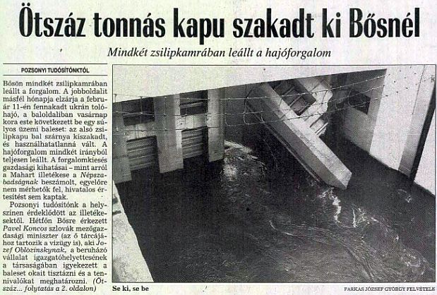 «(Pozsonyi tudósítónktól) Bősön mindkét zsilipkamrában leállt a forgalom. A jobboldalit másfél hónapja elzárja a február 11-én fennakadt ukrán tolóhajó, a baloldaliban vasárnap kora este következett be egy súlyos üzemi baleset: az alsó zsilipkapu bal szárnya kiszakadt, és használhatatlanná vált. A hajóforgalom mindkét irányból teljesen leállt. A forgalomkiesés gazdasági kihatásai – mint arról a Mahart illetékese a Népszabadságnak beszámolt, egyelőre nem mérhetők fel, hivatalos értesítést sem kaptak.