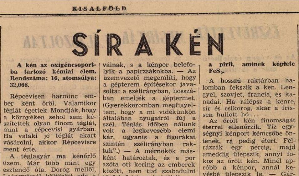 Alig esztendővel azután jártam Répcevisen, hogy bezárták az öreg téglagyárat, mert korszerűtlennek találták, miközben nyereséggel működött. (De hát annak idején nem ez volt egyetlen rossz döntés…) A téglagyárban még mintegy 60-an dolgoztak (a község lakóinak száma már akkor is csak mintegy 350 volt, ráadásul bőven volt alapanyag a téglához), a helyén megnyílt kénőrlő (erről szól a Kisalföld című megyei lapban 1964. szeptember 20-án megjelent tudósítás!) harmadannyi embert sem foglalkoztatott. Mai utóda a Kén Vegyipari Termelő és Kereskedelmi Kft.
