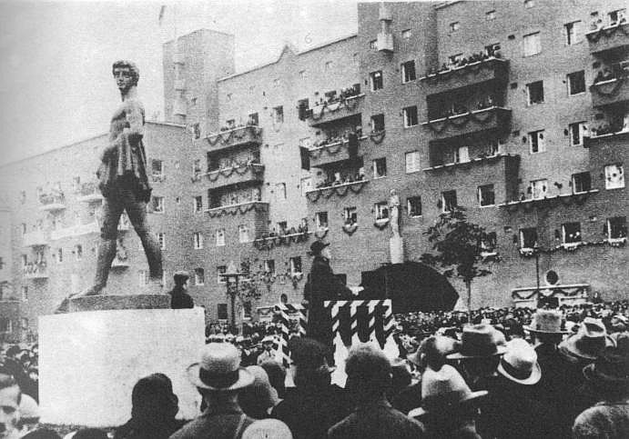 Ez pedig ugyanarról, ám 92 évvel ezelőtti felvétel: az ikonikus Karl-Marx-Hof az átadásakor, 1931. október 12-én: