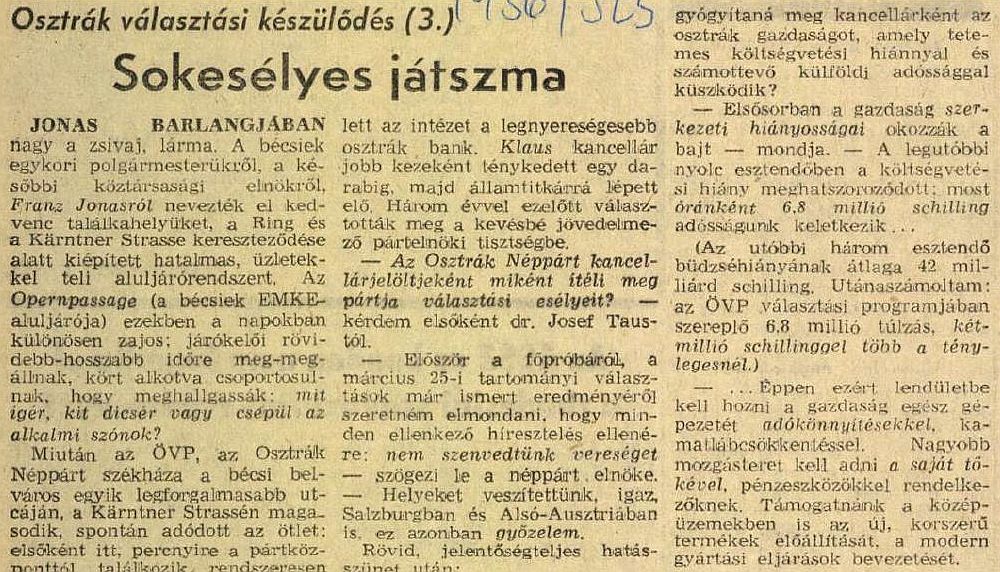 – Szóval Pestről jött – fogad a keskeny folyosóról nyíló szobájában dr. Josef Taus, az ÖVP elnöke. Fáradtnak, megviseltnek látszik, mondom is neki, hogy sokáig nem zavarom. Mintha nem hallaná az udvariasnak szánt felmondatot: