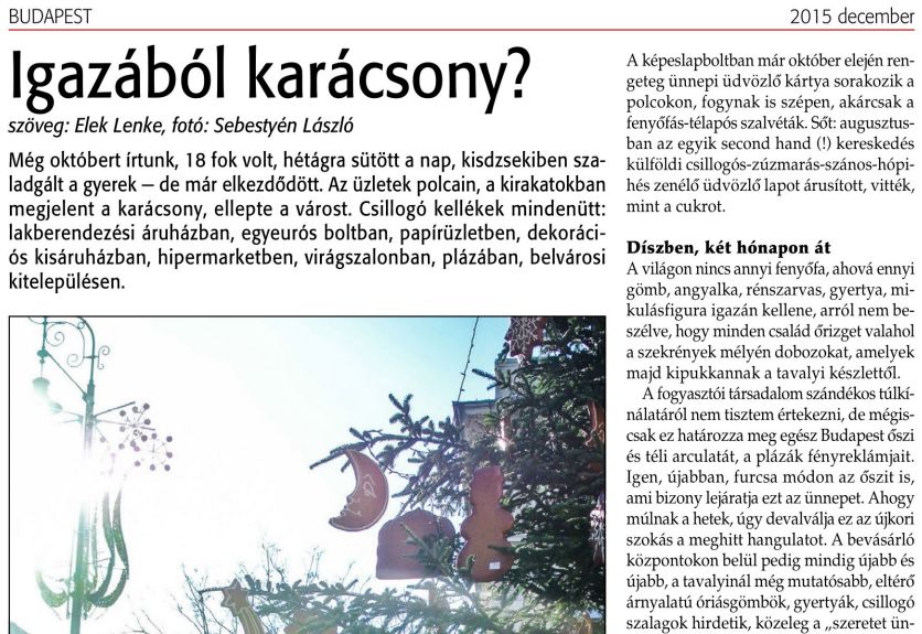 «Még októbert írtunk, 18 fok volt, hétágra sütött a nap, kisdzsekiben szaladgált a gyerek − de már elkezdődött. Az üzletek polcain, a kirakatokban megjelent a karácsony, ellepte a várost. Csillogó kellékek mindenütt: lakberendezési áruházban, egyeurós boltban, papírüzletben, dekorációs kisáruházban, hipermarketben, virágszalonban, plázában, belvárosi kitelepülésen.