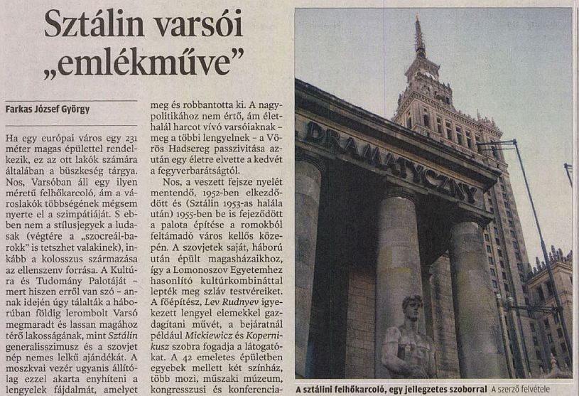 Ha egy európai város egy 231 méter magas épülettel rendelkezik, ez az ott lakók számára általában a büszkeség tárgya. Nos, Varsóban áll egy ilyen méretű felhőkarcoló, ám a városlakók többségének mégsem nyerte el a szimpátiáját. S ebben nem a stílusjegyek a ludasak (végtére a „szocreál-barokk” is tetszhet valakinek), inkább a kolosszus származása az ellenszenv forrása. A Kultúra és Tudomány Palotáját – mert hiszen erről van szó – annak idején úgy tálalták a háborúban földig lerombolt Varsó megmaradt és lassan magához térő lakosságának, mint Sztálin generalisszimusz és a szovjet nép nemes lelkű ajándékát. A moszkvai vezér ugyanis állítólag ezzel akarta enyhíteni a lengyelek fájdalmát, amelyet porig égetett fővárosuk felett éreztek. 1944-ben, a varsói felkelés idején a szovjet csapatok a Visztula túlpartjáról gyakorlatilag lábhoz tett fegyverrel figyelték, miként robbantják fel egymás után a háztömböket a nácik. Sztálin azért nem sietett a segítségadással, mert a felkelést a lublini kommunista kormánnyal szemben álló londoni emigráns vezetés szervezte meg és robbantotta ki. A nagypolitikához nem értő, ám élethalál harcot vívó varsóiaknak – meg a többi lengyelnek – a Vörös Hadsereg passzivitása azután egy életre elvette a kedvét a fegyverbarátságtól.