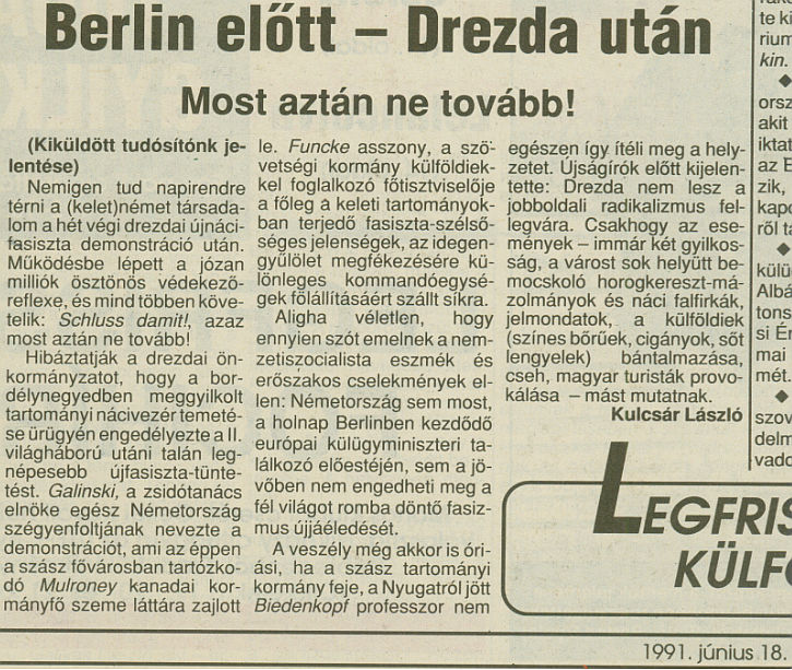 A veszély még akkor is óriási, ha a szász tartományi kormány feje, a Nyugatról jött Biedenkopf professzor nem egészen így ítéli meg a helyzetet. Újságírók előtt kijelentette: Drezda nem lesz a jobboldali radikalizmus fellegvára. Csakhogy az események – immár két gyilkosság, a várost sok helyütt bemocskoló horogkereszt-mázolmányok és náci falfirkák, jelmondatok, a külföldiek (színes bőrűek, cigányok, sőt lengyelek) bántalmazása, cseh, magyar turisták provokálása – mást mutatnak.»