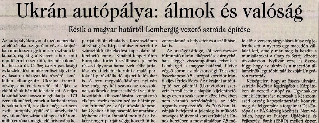 Az országot átfogó, sőt azon messze túlmutató ukrán elképzelések árnyékában eléggé visszafogottnak tetszik a Lemberget a magyar határral, illetve végső soron az olaszországi Trieszttel összekapcsoló 5. európai korridor iránti kijevi érdeklődés. Az ukrajnai autóútépítő szolgálatnál (Ukravtodor) szerzett értesüléseink alapján kijelenthető, hogy ezen a szakaszon a közeli években nem várható sztrádaépítés, az idén ugyanis megkezdték, és 2006-ban kívánják befejezni a jelenleg is működő országos főútvonal korszerűsítését. Ennek keretében a most általában 7,5 méter széles burkolatot 9 méteresre bővítik, felújítják a hidakat, egyéb műtárgyakat. Önmagában persze ez a feladat is jelentős, az érdeklődés is ennek megfelelő: a versenytárgyalásra húsz cég jelentkezett, a nyertes egy macedón vállalat lett, amely már meg is kezdte a munkálatokat a Csap és Sztrij közötti útszakaszon. Nyilván ezzel is összefügg, hogy az ukrán és a macedón államelnök legutóbbi találkozóját Ungváron tartották.