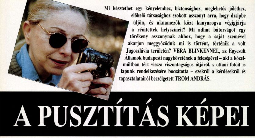 Mi késztethet egy kényelemhez, biztonsághoz, meglehetős jóléthez, előkelő társasághoz szokott asszonyt arra, hogy dzsipbe üljön, és aknamezők közt kanyarogva végigjárja a rémtettek helyszíneit? Mi adhat bátorságot egy törékeny asszonynak ahhoz, hogy a saját szemével akarjon meggyőződni: mi is történt, történik a volt Jugoszlávia területén? Vera Blinken – az Egyesült Államok budapesti nagykövetének a felesége –, a minap tért vissza viszontagságos útjáról, s ezekről a kérdésekről, tapasztalatairól beszélgetett vele Trom András. Vera asszony az ott készített fotóit is lapunk rendelkezésére bocsátotta.