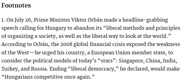 Az Atlantic Magazine az Orbán Viktorra vonatkozó részhez lábjegyzetben hozzáfűzi: a miniszterelnök a minap nagy feltűnést keltő beszédben hirdette meg, hogy Magyarországnak el kell hagynia a társadalomszervezés liberális módszereit és elveit, valamint a liberális szemléletmódot…
