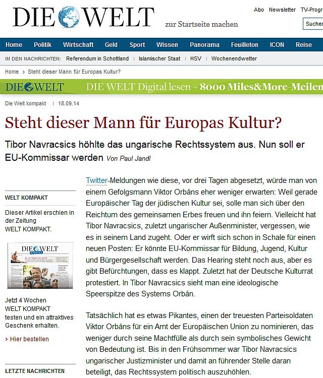 „Ez az ember képviseli majd az európai kultúrát?” – kérdezi Navracsics Tibor biztosi jelölése kapcsán a Die Welt német konzervatív lap, magyarázatként hozzátéve, hogy a politikus aláásta a magyar jogrendet. A strasbourgi meghallgatás még odébb van, de félő, hogy összejön a jóváhagyás.