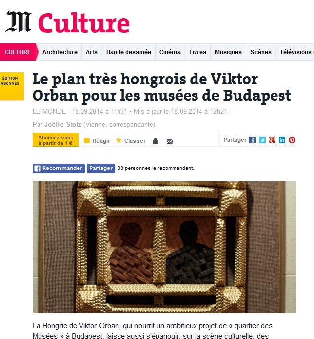 „Orbáni művészet – Orbán Viktor nagyon magyar terve a budapesti múzeumok számára” címmel a tekintélyes francia újság, a Le Monde arról ír, hogy a miniszterelnök Magyarországa, amely a múzeumi negyed becsvágyó tervét dédelgeti, a kultúrában is engedi elharapózni a határozottan retrográd irányzatokat. A Műcsarnok új igazgatójának nyilatkozatai elborzasztották a művészeket, akik 2010 óta egyébként is durva megpróbáltatásoknak vannak kitéve. De miért bízták az intézményt egy olyan emberre, aki minden bizonnyal irtózik a kortársi nyugati művészettől?…