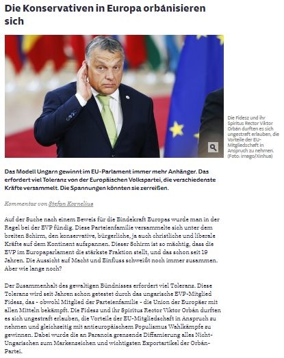 „…In einem aufsehenerregenden Artikel warnt Stefan Kornelius in der „Süddeutschen”, nicht Orban, der das Geld von der EU nimmt und sie zugleich beschimpft, werde von der Europäischen Volkspartei gemaßregelt, sondern diese würde sich möglicherweise infolge des Zeitgeistes von rechts orbanisieren Kornelius stellt dabei die Kernfrage: Wie viel Fidesz kann die EVP ertragen, bevor sie zerbricht?…”