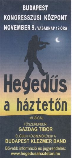– Ez az ismertség 1996-ban kezdődött, amikor a budapesti Madách Színházban, hatalmas újításként a héttagú zenekar feltelepedett a színpadra, s egészen másként adta elő a darab zenei részét. Kerényi Imre megkért, hogy „klezmeresítsem” a zenei anyagot. Nagyon komoly feladat volt, hiszen ez egy 28 tagú zenekarra írott darab, s kezdetben kevés bátorságom volt hozzá: képes vagyok-e rá. Ám aki mer, az nyer, s annyira jól sikerült, hogy több, mint 270 előadást játszottunk. Majdnem kilenc évig ment a darab a Madách Színházban. Azóta is emlegetik Budapesten ezt a páratlan sikerű előadást.