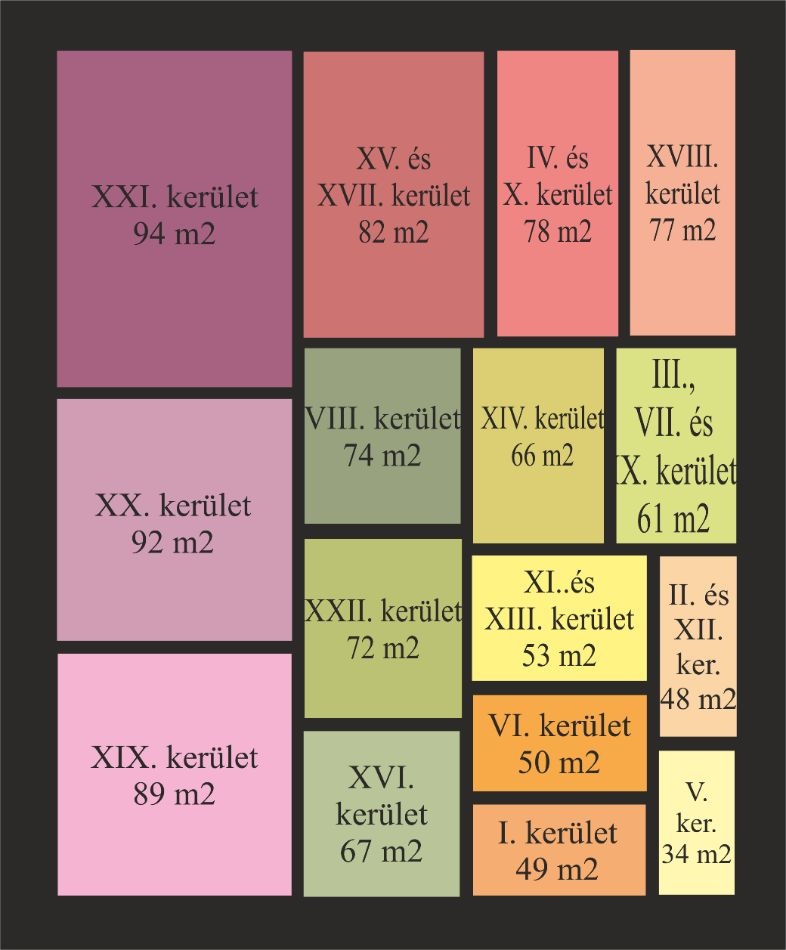 Nem meglepő, hogy a külső városrészekben lehet ugyanakkora összegből a legnagyobb méretű lakást vásárolni, hiszen ott a legalacsonyabbak a négyzetméterárak. A belvárosban és a központi budai kerületekben sokkal kisebb lakásokat lehet ezért a pénzért kapni. Csaknem háromszoros a méretbeli különbség a legolcsóbb (XXI. kerület) és a legdrágább (V. kerület) között. Előbbiben 94, utóbbiban csupán 34 négyzetméteres ingatlan vásárolható.