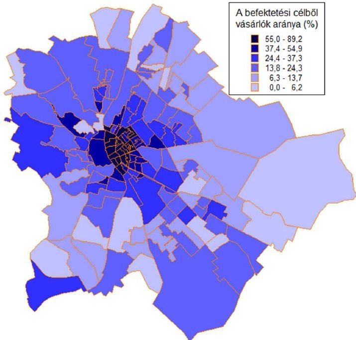 Jól kirajzolódik a Nagykörút vonala, melyen belül több, mint 55 százalék a befektetési célú vásárlások aránya. Az V. kerületben ez az érték meghaladja a 70 százalékot is. A „központi magot” övező területeken is még 35–55 százalék körüli a befektetők jelenléte, mely érték a városperemek felé egyre csökken.