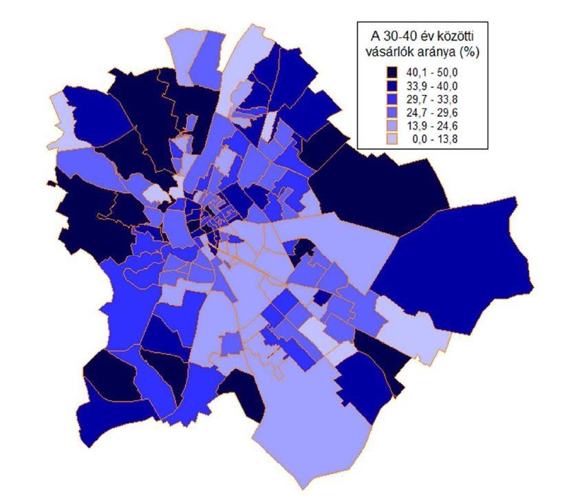 A 30-40 év közötti vásárlók jellemzően nagyobb lakásba költöznek a család bővülésével összhangban. Ennek megfelelően arányuk a külső, sokszor családi házas övezetekben a legmagasabb .